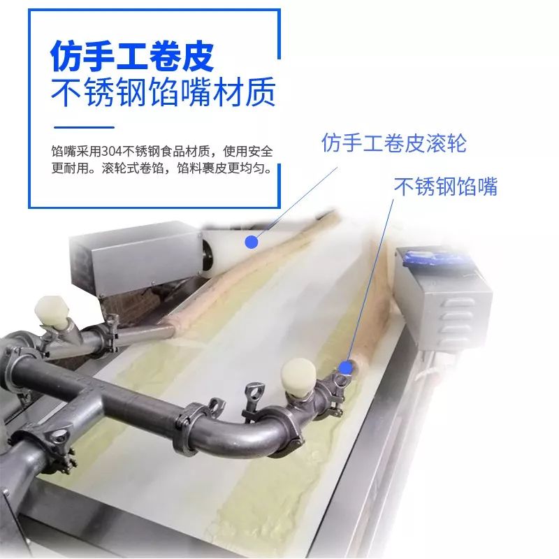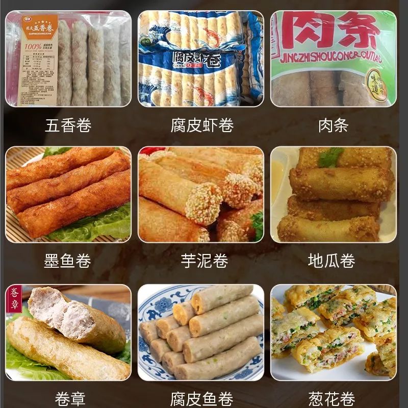 / 腐皮卷機(jī)是一款完全取代手工包各種腐皮類的機(jī)器,完全解決傳統(tǒng)手工包個種肉卷、卷章、魚卷、蝦卷、福建五香卷、潮汕肉條、腐皮蝦卷、墨魚卷、芋泥卷、地瓜卷等各種卷類食品。做出的各種卷類食品造型好看、長短均勻,葉片泵的供料機(jī)不破壞物料原有形狀,獨有的圓形收口切斷設(shè)計使其接近手工制作。全自動包漿、卷條、切斷成型,大大的提升了生產(chǎn)效率,滿足了批量化生產(chǎn)的速度要求。/